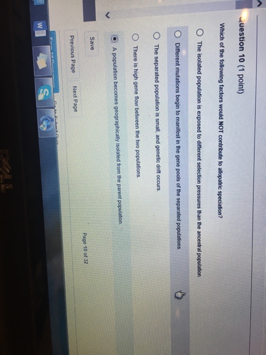 Question 7 1 pts Which of the following factors would not contribute to allopatric speciation. Which of the following factors would not contribute to allopatric speciation. A The separated population is small and genetic drift occurs.